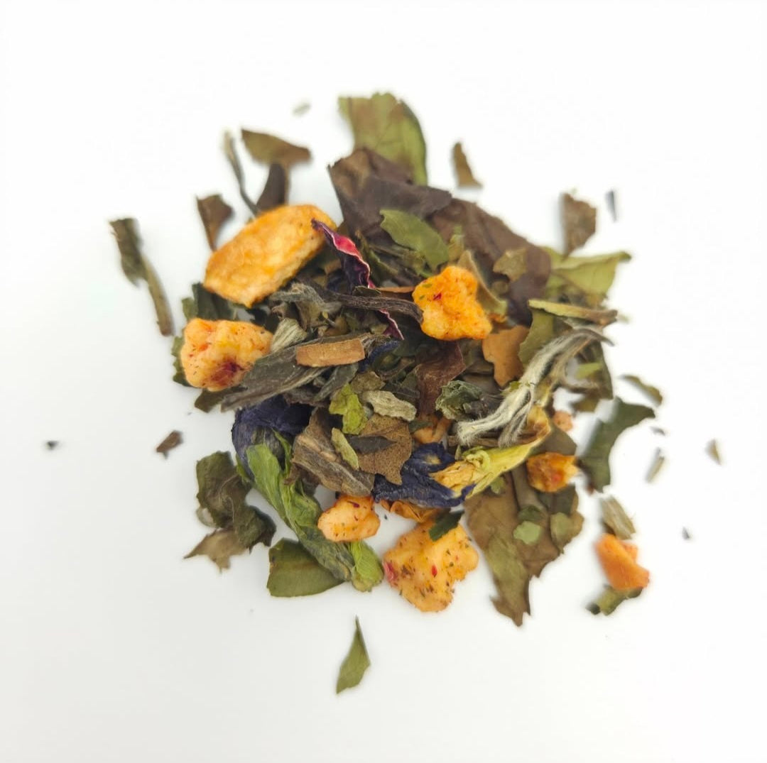 Ingredients: white peony, butterfly pea flowers, apple pieces, orange peel, natural peach flavor, peach pieces, pineapple pieces, mango pieces, rose petals, strawberry, papaya flavor